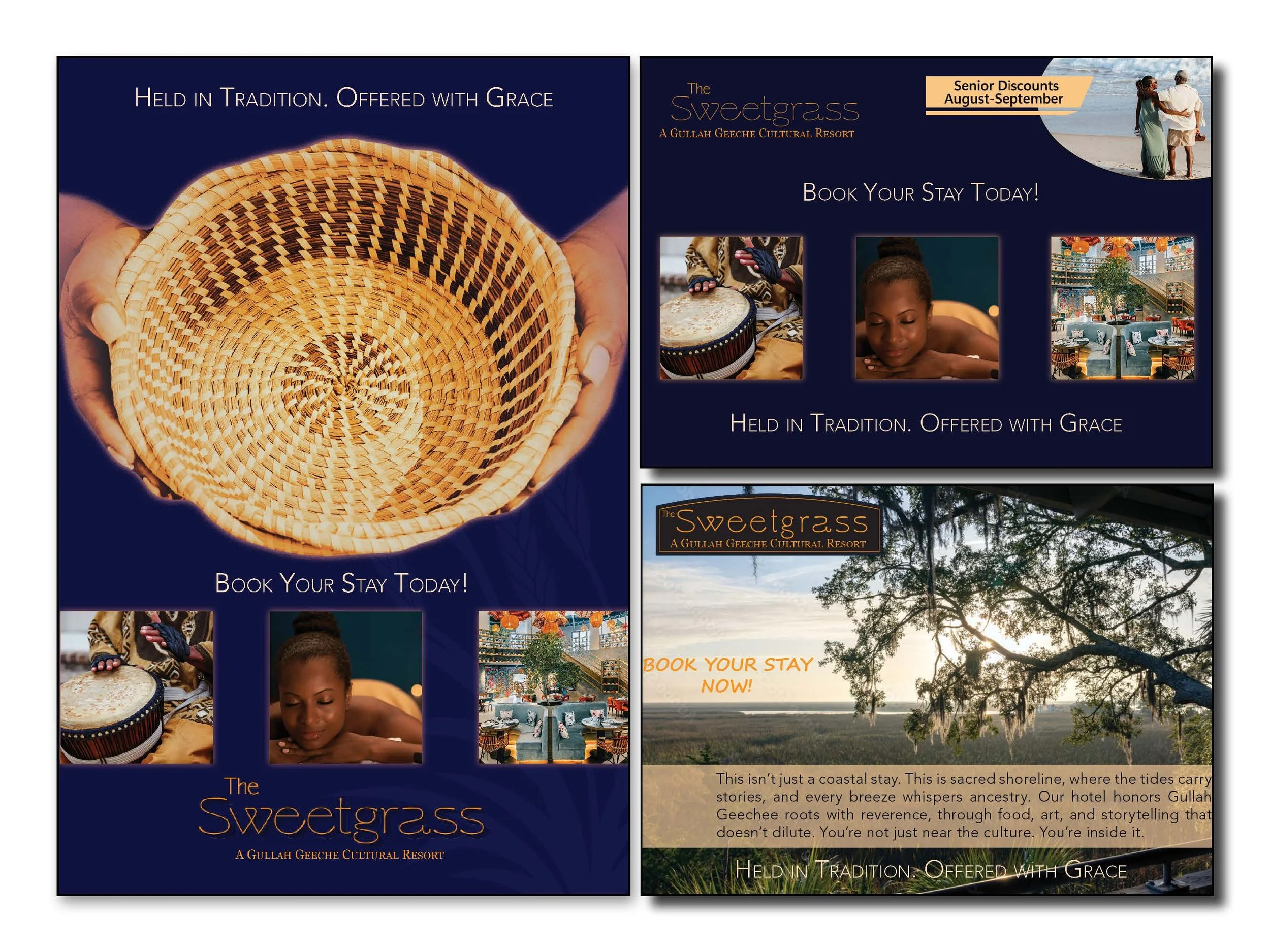 The Sweetgrass Resort is a boutique hotel identity and web experience rooted in Gullah Geechee heritage. This project intertwines coastal flora, history, and hospitality reflecting a culture that’s both grounded and graceful. Tagline: ‘Held in tradition, offered in grace.’